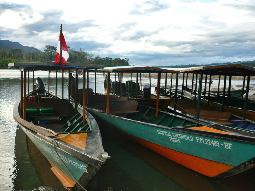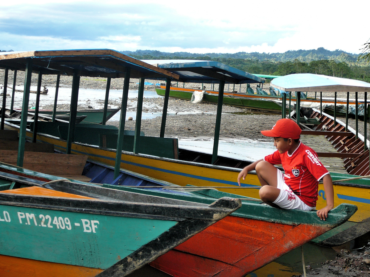 Après la visite du jardin botanique, nous repartons vers Atalaya. Nous nous arrêtons au mirador pour profiter de la vue, mais le temps est à la pluie, la vue est bouchée. Il faisait pourtant grand soleil deux heures auparavant ! Nous poussons jusqu’à Atalaya, pour faire la balade en pirogue. Nous voulons aller voir une collpa de guacamayos. C’est un endroit dans la forêt où le sol est très argileux, et les perroquets s’y rendent par centaines, à la levée et tombée du jour, pour en avaler un peu. Cela leur permet d’annuler les effets toxiques de certaines plantes qu’ils mangent. D’autres animaux s’y rendent aussi, comme les tapirs par exemple. Il y a de nombreux endroits comme celui-là disséminés dans la forêt amazonienne, et certains sont devenus très touristiques, parce qu’ils permettent d’observer un grand nombre d’animaux assez facilement. Nous nous rendons au petit port pleins d’espoir, mais le capitaine d’un bateau met rapidement fin à nos espérances. Les animaux ne se rendraient à la collpa que par temps ensoleillé…