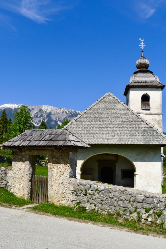 La plupart des gens font l’aller-retour dans les gorges de Vintgar. Mais nous, on n’aime pas trop faire le même chemin à l’aller et au retour, on préfère les boucles, question de principe. Alors en sortant des gorges, nous continuons sur le chemin qui s’enfonce dans la forêt. Une belle vue sur les montagnes du parc national du Triglav, la petite église de Sveta Katarina, toute mignonne, des pâtures, des moutons et des vaches, puis une vue magnifique sur le massif des Karavanke et sur la ville de Bled, et surtout pas un touriste a l’horizon. Non, vraiment, on a bien fait de ne pas vouloir revenir sur nos pas par le même chemin.